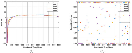 (a) SINR with respect to the number of iterations, (b) forgetting factor variation of each user with respect to the iteration number.