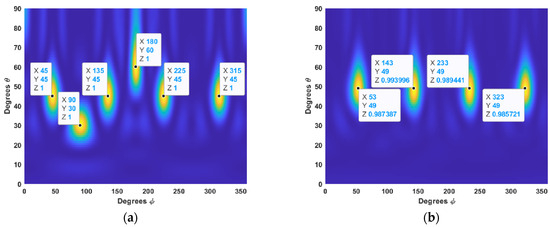 In Figure 9, the normalized radiation pattern of the estimated transmitter signals is given. The purpose here is to demonstrate if the antenna array beams are correctly directed to each desired user direction, as well as with canceled interference signals, after 5 s (as specified in the simulation time) using our proposed SW-AFVF-CMARLS algorithm. In Figure 9a, users and interference signals are located at their initial directions. In Figure 9b, after the proposed algorithm was applied, the directions of the users are given with suppressed interference. The interference-free displacements of the users are clearly seen.