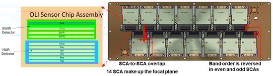 Operational Land Imager (OLI) focal plane layout. Each sensor is made up of 14 individual linear arrays or Sensor Chip Assemblies (SCAs). The placement of the Short-Wave Infrared (SWIR) and Visible and Near Infrared (VNIR) are designated within the figure.
