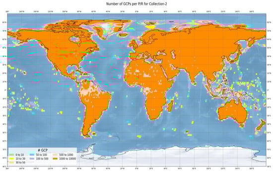 The location of the Geometric Supersites globally is shown in Figure 3. This imagery is composed of USGS Digital Orthophoto Quadrangle (DOQ) data, GPS-controlled Satellite pour l’Observation de la Terre (SPOT) imagery or the Australian Geographic Reference Image (AGRI) provided by Geoscience Australia [9,10]. The C2 GCPs are shown in Figure 4 and often used for a further verification of the calibration. The C2 GCPs are made up of imagery from the Enhanced Thematic Mapper Plus (ETM+) aboard L7 and the OLI-1 aboard L8. Figure 4 demonstrates both the distribution and the density of the C2 GCPs. The Geometric Supersites are estimated to provide an absolute accuracy of approximately 6 m, whereas the C2 GCPs are estimated to provide an absolute accuracy of approximately 9.5 m.
