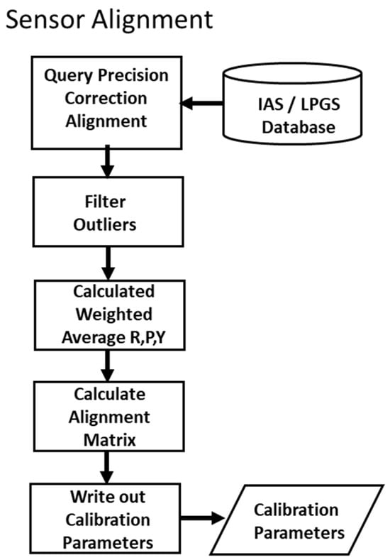 The Sensor Alignment algorithm, which refers to the OLI-to-Spacecraft alignment, uses a time sequence of results generated by the precision correction process to estimate the orientation of the OLI coordinate system relative to the spacecraft attitude determination coordinate system. Analyzing a time sequence of measured alignment results makes it possible to smooth out random scene-to-scene pointing errors to estimate, and correct for, any underlying systematic alignment errors. Part of the logic within the precision correction step takes the solution output and converts it to apparent alignment errors for each individual scene. These individual scene alignment parameters can then be filtered for outliers, smoothed into a long-term trend, and used within the LPGS to improve upon the accuracy of the L1GT products created. An Architecture Diagram is shown for this process in Figure 5. Precision estimated alignment results are extracted from both the IAS and LPGS databases. Outliers are removed based on the number of GCPs used in the precision solution step. Once outliers are removed, a weighted average is calculated over the data, with the roll, pitch, and yaw values being used to determine a new alignment matrix.