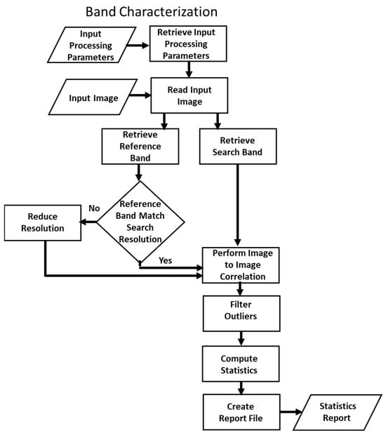 An Architecture Diagram for the Landsat 8 and 9 Band Characterization algorithm is shown. The displacement between each band combination is measured using image-to-image correlation techniques. The statistics for these displacements are calculated and used in determining any necessary inter instrument or between instrument calibration parameter changes that may be needed.