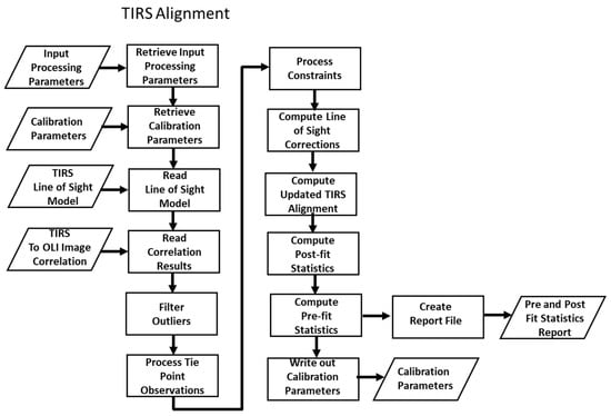 The TIRS Alignment algorithm uses an OLI short-wave infrared (SWIR) band image as a reference, comparing it to a SCA-separated TIRS 10.8 µm band image. An L1TP image is used for the comparison. Each SCA of the TIRS instrument in the L1TP image is compared to the SCA-combined OLI reference band to measure both systematic full-scene TIRS-to-OLI misregistration and SCA-specific deviations from the scene-average registration perspective. The measured deviations are used to estimate corrections to the TIRS-to-OLI alignment matrix and to the 10.8 µm band Legendre polynomial coefficients that model the lines-of-sight for each SCA. An Architecture Diagram is shown for this process in Figure 7. The displacement between the SWIR band (band 6) of the OLI instrument and the 10.8 µm (band 10) of the TIRS instrument is measured. This band combination was chosen through an analysis based on the best band combination for the image correlation step between the two instruments. This analysis was determined through both the Landsat 8 mission as well as the previous Landsat missions Landsat 5 (L5) and Landsat (L7), which also contained a thermal band. An outlier rejection is performed on these measurements based on a chosen tolerance and the Student’s t-test distribution. These measured displacements between these two bands are used to adjust the orientation parameters between the TIRS and OLI instruments. These new orientation parameters are based on adjusting the TIRS line of sight’s to better align the instrument optical axis to that of the OLI instrument optical axis. The statistics associated with this orientation for prior and post adjustments are determined.