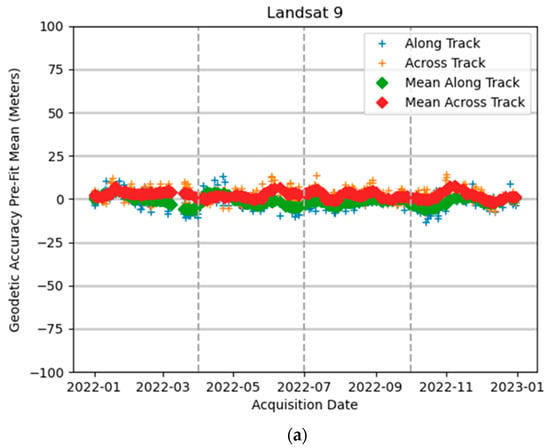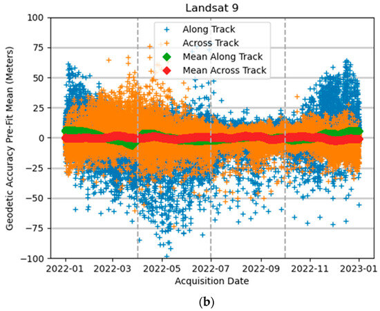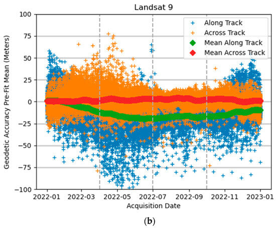 Landsat 9 geodetic accuracy results. Top graphic (a) shows the geodetic accuracy pre-fit along- and across-track mean results based on the Geometric Supersite ground control. The bottom graphic (b) shows the geodetic accuracy pre-fit mean along- and across-track results based on the Landsat collection 2 Ground Control. These results represent values prior to any calibration updates that were performed. Both graphs are results for Landsat 9.