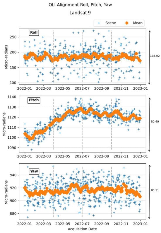 Estimated Landsat 9 (L9) Operational Land Imager-2 (OLI-2) sensor alignment parameters based on the results calculated from the Geometric Supersites given in units of micro-radians. From top to bottom, the angles represent the roll, pitch, and yaw alignment parameters. These results are used to calculate the final roll, pitch, and yaw alignment numbers that will be placed in the Calibration Parameter File (CPF) for product generation. The values represent the time range from 1 January 2022 up to 1 January 2023 and calculations performed prior to the reprocessing campaign that occurred in early 2023.