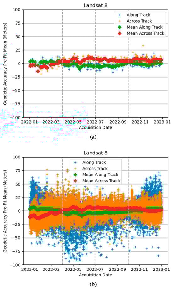 Landsat 8 geodetic accuracy results. Top graphic (a) is the geodetic accuracy pre-fit along- and across-track mean results based on the Geometric Supersite ground control for the Landsat 8 (L8) Operational Land Image-1 (OLI-1). The bottom graphic (b) is the geodetic accuracy pre-fit mean along- and across-track results based on the Collection 2 ground control. Both graphs are results for Landsat 8.