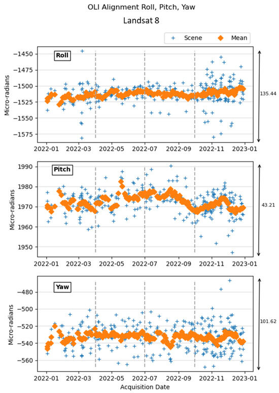 Landsat 8 (L8) Operational Land Imager-1 (OLI-1) senor alignment parameters, roll, pitch, and yaw. Values are given in units of micro radians (μrad). An update was made with respect to the transition from first quarter of 2022 (1 January 2022) and second quarter of 2022 (1 April 2022).