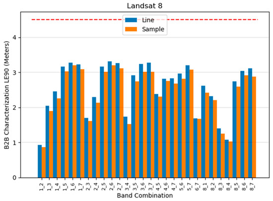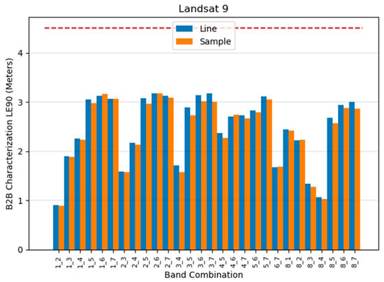 Landsat 9 (L9) Operational Land Imager-2 (OLI-2) band-to-band characterization results. Each band combination is shown for the line and sample direction. Results are given in units of meter (m) and 90 Percent Linear Error (LE90). The dotted red line represents the band registration requirement for the OLI-2 instrument of 4.5 m LE90. The plot was generated, and the numbers were calculated prior to an OLI-2 sensor alignment update. The results represent the time range from 1 January 2022 to 1 January 2023.