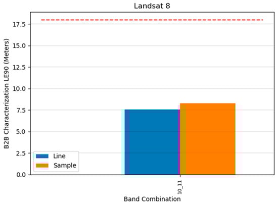 Figure 18 shows the L8 TIRS-1 band-to-band characterization results. The measured band-to-band characterization was 7.584 and 8.268 m LE90 in the line and sample directions, respectively. These band-to-band characterization numbers are based on 209 scenes. As can be observed from the figure and comparing these results to the requirement of 18 m LE90, performing a line-of-sight calibration update is not needed.