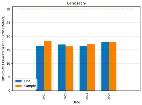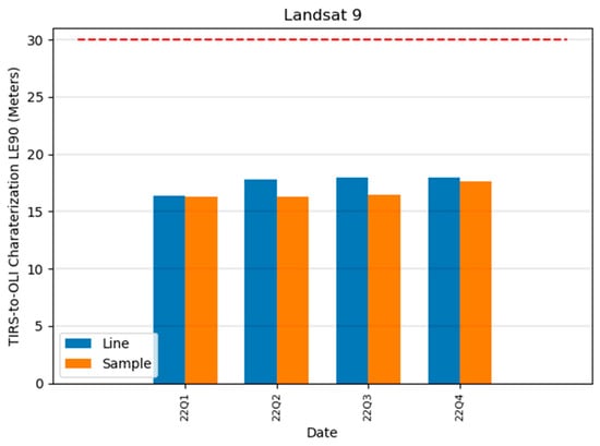 Landsat 9 (L9) Thermal Infrared-2 (TIRS-2) and Operational Image-2 (OLI-2) alignment measured through OLI-2 SWIR-to-TIRS-2 10.8 µm band characterization. Values are given with respect to 90 Percent Linear Error (LE90) in units of meters (m). Results are broken up by 3-month time ranges along with line and sample direction. The dotted red line represents the requirement for L9 TIRS-to-OLI alignment of 30 m LE90. These results are for the time range from 1 January 2022 to 1 January 2023 and are prior to the reprocessing campaign that occurred in early 2023.