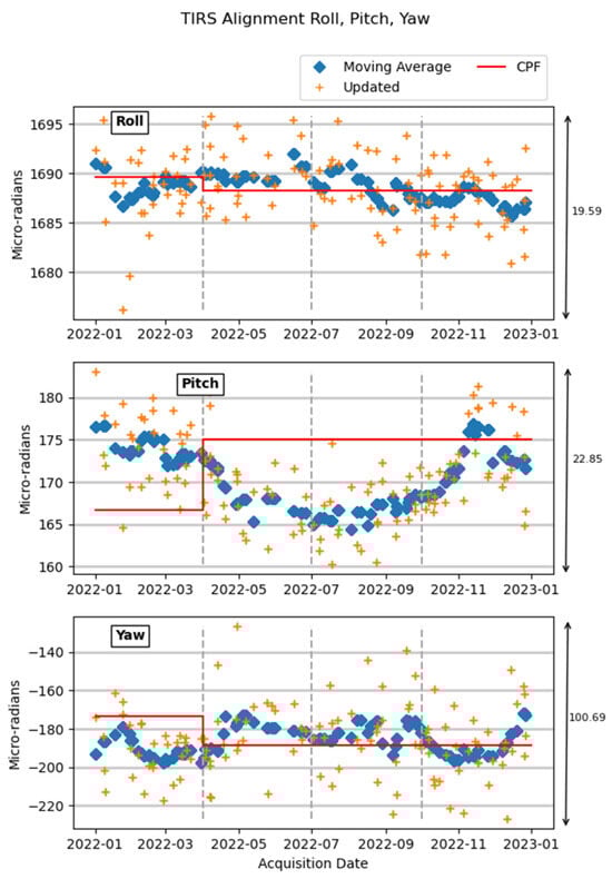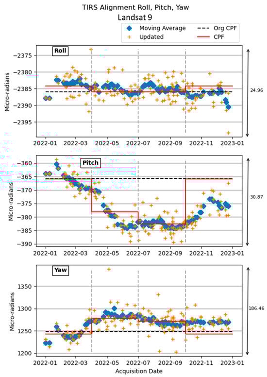 During 2022, L8 had one OLI-1 to spacecraft sensor alignment and one TIRS-1 to OLI-1 alignment performed. This change occurred during the second quarter of 2022. During 2022, L9 had quarterly updates performed for both the OLI-2 to spacecraft sensor alignment and the TIRS-2 to OLI-2 alignment. These calibration updates are shown in Table 1.