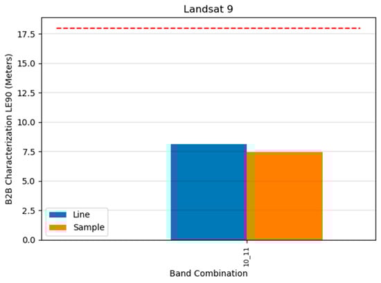 New L9 TIRS-to-OLI orientation parameters were calculated based on the values shown in Figure 20. These new orientation parameters were used in the reprocessing campaign, and the new L9 TIRS-to-OLI-measured band-to-band characterization results based on these orientation parameters are shown in Figure 21. With respect to the measured L9 TIRS-to-OLI results and requirements, the LE90 measured values were calculated as 17.280 and 17.373 m LE90 in the line and sample directions, respectively. These L9 TIRS-to-OLI characterization numbers were based on 71 scenes.