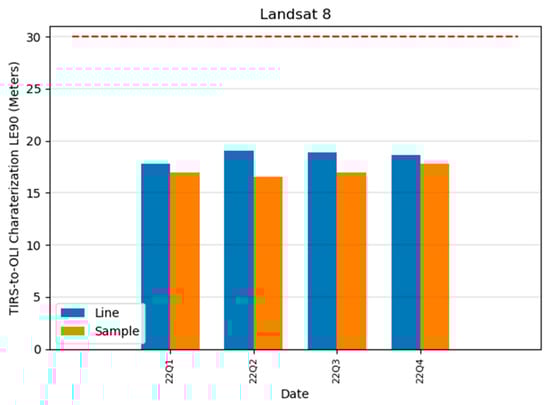 Landsat 8 (L8) Thermal Infrared-1 (TIRS-1) and Operational Image-1 (OLI-1) alignment measured through OLI-1 SWIR-to-TIRS-1 10.8-µm band characterization. Values are given with respect to 90 Percent Linear Error (LE90) in units of meters (m). Results are broken up by 3-month time ranges in the line and sample directions. The dotted red line represents the requirement for L8 TIRS-to-OLI alignment of 30 m LE90. These results are for the time range from 1 January 2022 to 1 January 2023.