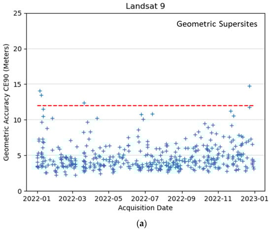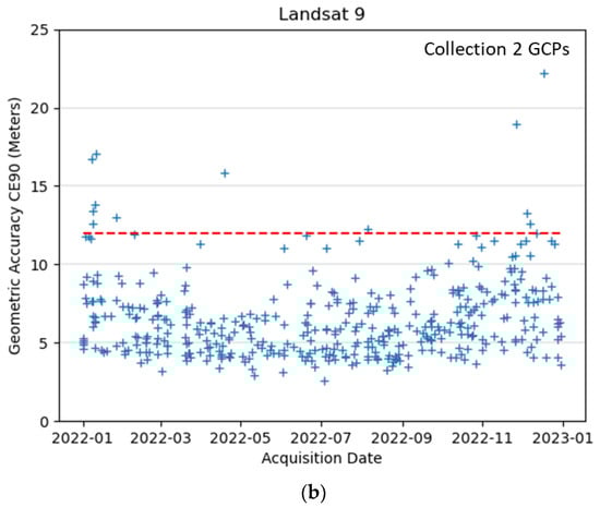 Landsat 9 (L9) geometric accuracy. The top plot (a) shows the Geometric Supersite geometric accuracy 90 Percent Circular Error (CE90) in meters (m). The bottom plot (b) shows the U. S. Geological Survey (USGS) Collection 2 Ground Control Library geometric accuracy of CE90 in meters. These values represent Level-1 Terrain Precision (L1TP) products after the calibration updates and the reprocessing that occurred in early 2023 for the L9 archive. The dotted red line represents the geometric accuracy requirement for L9, which is 12.0 m CE90. The values represent the time range from 1 January 2022 to 1 January 2023.