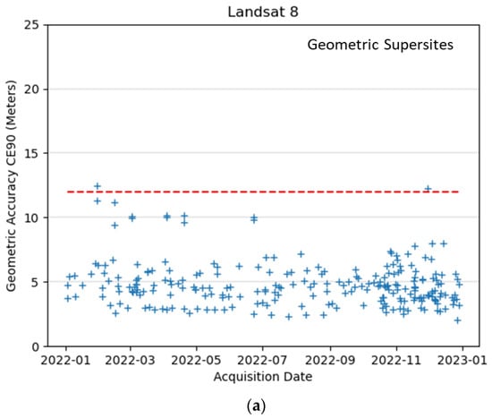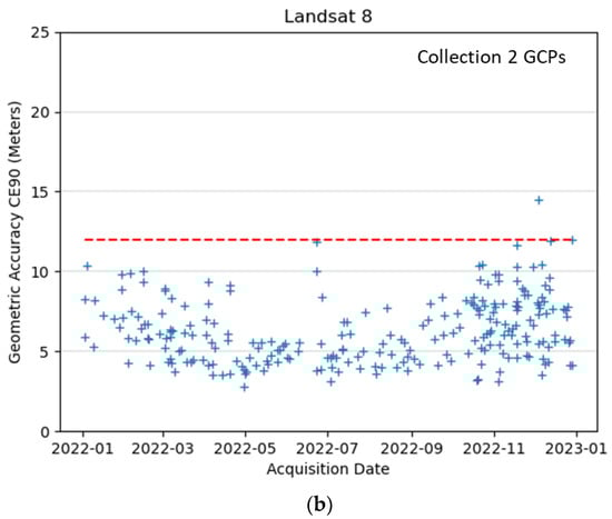 Landsat 8 (L8) geometric accuracy. The top plot (a) shows the Geometric Supersite geometric accuracy with 90 Percent Circular Error (CE90) in meters (m). The bottom plot (b) shows the U.S. Geological Survey (USGS) Collection 2 Ground Control Library geometric accuracy of CE90 in meters. The dotted red line represents the geometric accuracy requirement for L8 which is 30.0 m CE90. The values represent the time range from 1 January 2022 to 1 January 2023.