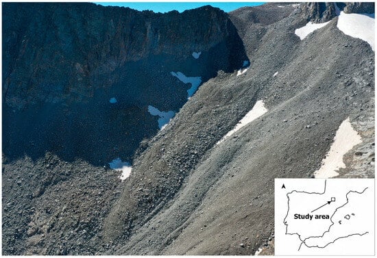 The Posets massif is the second highest in the Pyrenees and culminates at the peak of the same name at 3375 m a.s.l. On the northwest face of the Posets peak is located the rock glacier of La Paúl (Figure 1; 42°39′40″N, 0°26′34″E). Composed of frost-shattered debris, its tongue, about 400 m long, extends between 2800 m and 3000 m a.s.l. [12].