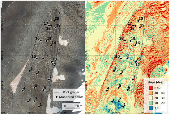 Location of the 20 singular points defined in the La Paúl rock glacier for monitoring by GNSS techniques (Coord. System ETRS89 UTM 30N). (Left) Orthomosaic from AP-UAV 2020. (Right) Slopes derived from the AP-UAV 2020 elevation model (resampled to 1 m resolution).