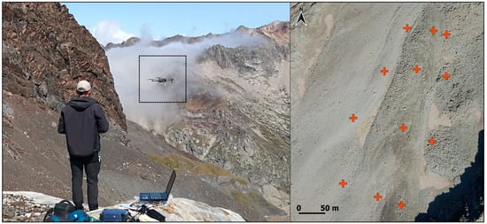 (Left) DJI Mavic 2 Pro UAV used in the photogrammetric flights of La Paúl in mid-flight (2019). (Right) Target locations (cross symbol) used in the photogrammetric flights on the rock glacier (2020). Orthomosaic from PNOA (CC-BY 4.0 scne.es).