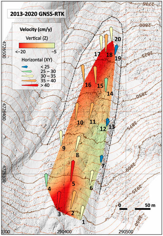 GNSS-RTK techniques showed velocities of 39 cm/y (2013/20; Table 2), TLS techniques 20 cm/y (2016/20; Table 3) and AP-UAV techniques 22 cm/y (2019/20). According to the IPA—Action Group ‘Rock glacier inventories and kinematics’ [30], these values allow classifying the periglacial landform as active, with average downslope displacements greater than 10 cm/y over its entire surface (Table 2 and Table 3; Figure 7 and Figure 8).