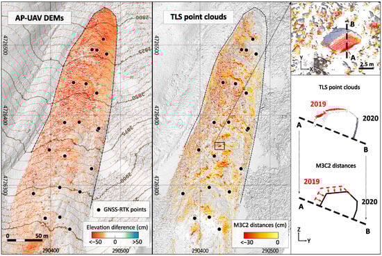 Surface changes of the La Paúl rock glacier between 2019–2020 (Coord. System ETRS89 UTM 30N). (Left) Significant vertical variations (LOD95%) determined through AP-UAV DEMs. AP-UAV hillshade DEM background. (Right) Significant 3D variations (LOD95%) determined through TLS point clouds. Shadowed TLS background.