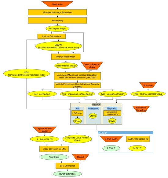 This work presents a methodology for the hydrological characterization of natural and urban landscapes, focusing on accurate estimations of infiltration capacity and runoff characteristics. By combining existing methods from the literature, we created a systemic process that integrates satellite-based vegetation maps, topography, and soil permeability data. This process generates a detailed vegetation classification and slope-corrected composite curve number (CNcα) map using information at the subpixel level, which is crucial for estimating excess runoff during intense precipitation events. The algorithm designed with this methodology is automated and utilizes freely accessible multispectral imagery. Leveraging the vegetation–impervious–soil (V-I-S) model, it is assumed that land cover comprises V-I-S components at each pixel. Automated Music and spectral Separability-based Endmember Selection is employed on a generic spectral library to obtain the most relevant V-I-S endmember spectra for a particular image, which is then employed in multiple endmember spectral mixture analysis to obtain V-I-S fraction maps. The derived fractions are utilized in combination with the Normalized Difference Vegetation Index and the Modified Normalized Difference Water Index to adapt the CNcα map to different seasons and climatic conditions. The methodology was applied to Esch-sur-Alzette, Luxembourg, over a four-year period to validate the methodology and quantify the increase in the impervious surface area in the commune and the relationship with the runoff dynamics. This approach provides valuable insights into infiltration and runoff dynamics across diverse temporal and geographic ranges.