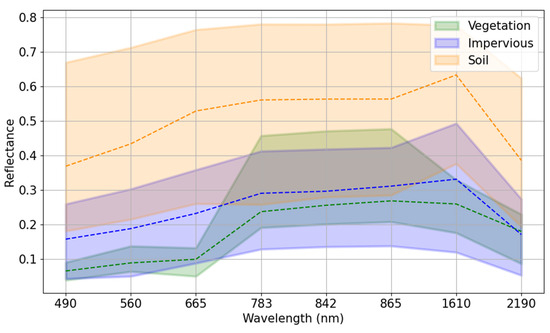 Interquartile (shaded areas) and mean reflectance (dash lines) for the V-I-S classes measured by the Sentinel-2 MSI sensor.