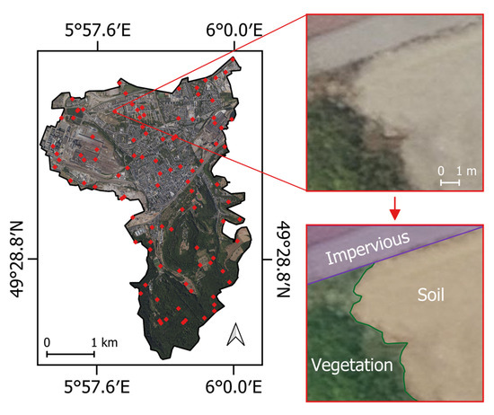 The 2022 orthophoto of Esch-sur-Alzette, with the validation locations indicated in red. Each validation location was manually divided into vegetation, impervious, and soil portions.