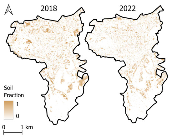 MESMA results in Esch-sur-Alzette over the study period showing the soil fractional covers in 2018 (left) and 2022 (right).