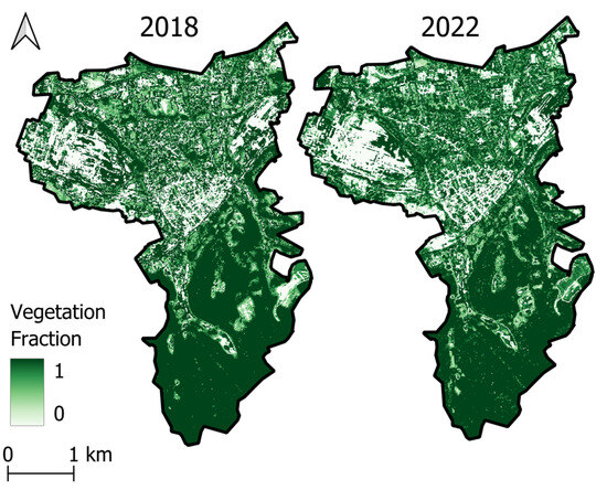 High vegetation fractions were detected in forested and farmland areas, with some of the urban greenery highlighted. There was little change in vegetation over the study period (Figure 7). Additionally, there was a loss of urban greenery in the urban center where a higher ISA was detected in 2022.