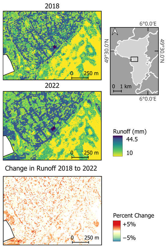 Runoff in the urban center of Esch-sur-Alzette in 2018 and 2022, along with the percent change in runoff during the study period.