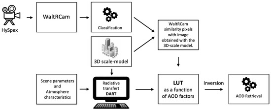 Figure 1 shows the different stages in the processing chain to obtain the AOD from the camera positioned on the ground. First, the experimental data obtained by WaltRCam are simulated using degraded HySpex data. Then, pixel classification is performed on this simulation in order to identify the class of each pixel (building, vegetation, etc.). The result is then compared to the image generated from a 3D scale-model for which each pixel class is also known. Then, colocated pixels for which the classes are different in the two images are removed using a similarity matrix. The DART radiative transfer model is configured with a given set of atmospheric characteristics and optical surface properties within the 3D environment described in the scale-model (called hereafter the Toulouse scale-model). DART allows us to build look-up tables (LUTs) based on different AOD values. The final step is to select the LUT that best represents the WaltRCam image and enables us to deduce the AOD. This section describes these steps in detail.