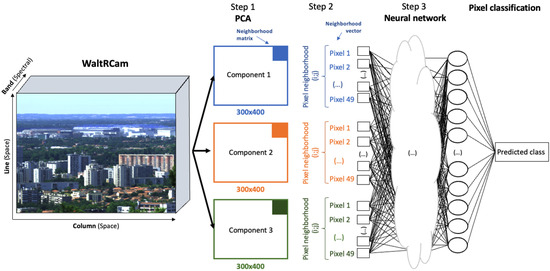 Due to the constant evolution of urban scenes, i.e., construction or demolition of buildings and changes to vegetation, and also due to the scarcity of Toulouse 3D scale-model updates, it is crucial to discard pixels that have a different class between the scale-model and the WaltRCam images. A pixel with a different class has different optical properties, resulting in bias when applying radiative transfer. In order to reduce this bias as much as possible, we removed pixels that do not correspond to the same class. To do this, we performed a classification on the WaltRCam image. This classification aims to assign a class to each pixel in the image, which is compared with the pixel class in the scale-model image. We used a method based on neural networks for automatic detection of the class of each pixel using a spectral and spatial pixel-by-pixel classification called SOC (Spatial and Spectral Optimized Classification; for more details, see [39]). Object detection approaches such as convolutional neural networks are very effective at detecting one or more objects [40] but cannot classify all the pixels in an image. The classification methods usually used for this type of problem, such as support-vector machine (SVM) and random forest, treat each pixel independently by analyzing only the spectral properties [41] but without considering the correlations between spatially adjacent pixels. However, neglecting the notion of neighborhoods (spatial dimensions) in classification can lead to situations for which the classes obtained are not spatially coherent [42]. Morphological profiles [43] have been used for this type of task, but they are very time-consuming [44], which is a major drawback for applications requiring fast, near-real-time results on large datasets. SOC using a neural network was optimized for this type of problem and is as fast as possible in terms of computation time. In the Toulouse 3D scale-model, an image is composed of six different classes: trunk, leaves, grass, roof, building, and sky. Differently, in the WaltRCam image, we have identified five classes: namely, vegetation (grouping together trunk, wood, and leaf), roof, building, horizon (distant pixels that are more difficult to identify), and sky. A subset of pixels was manually labeled (10,000 pixels) based on the classes identified for training (80% of the labeled pixels) and testing (20%) machine learning algorithms. Similar proportions of pixels for each class were labeled to limit possible errors or biases when training the neural network. We found a classification accuracy of about 99%. Figure 2 presents the classification strategy.