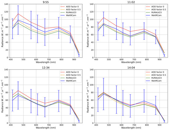 where is the initial AOD value of the RURALV23 atmosphere for the wavelength , and k is the AOD factor. Figure 3 shows the radiance look-up tables as a function of wavelength for two AOD factors (0 and 0.5) and the WaltRCam’s corresponding radiance averaged for the entire image. The LUT clearly shows similar behavior and delineates the range of the WaltRCam values (represented in blue).