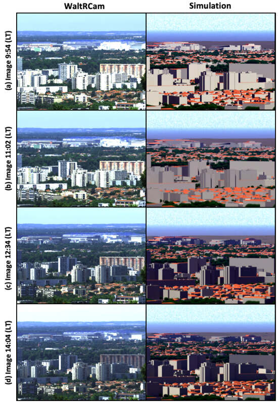 The images captured on 30 June 2020 at 9:55, 11:02, 12:34, and 14:04 LT are presented in Figure 4. These images highlight the main advantage of a 3D approach by showing the impact of light variation over the course of the day, including the presence of shadows. Calculating radiative transfer in a peri-urban scene means that the geometric complexity of such an environment can be taken into account to make simulation results more realistic. The distance between the location of the camera and the background of the image is limited to 12 kilometers in the Toulouse 3D scale-model. Hills, forests, and a few buildings in the background of the image are not described in the simulated DART image. Areas of differences between the observed image and the simulated image are removed by correcting the simulated scene using SOC pixel classification (see Section 3.3).