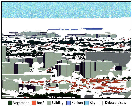 Image of pixel class similarity. The white areas (deleted pixels) represent the pixels with a different class between the calculated classes and the WaltRCam classes (about 30% of the pixels in the image). Vegetation, roof, buildings, horizon, and sky are colored in black, red, grey, dark blue, and light blue, respectively.