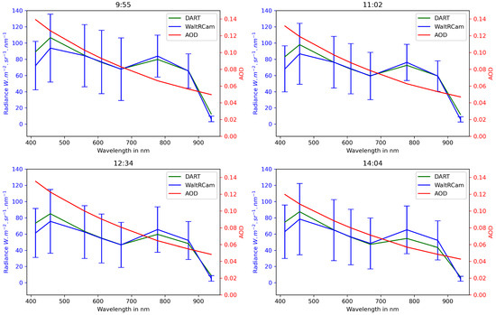 Note that the relative biases calculated for the first seven bands (excluding 938 nm) are 4%, 4%, 2%, and −1% for 9:55, 11:02, 12:34, and 14:04 LT, respectively. We have excluded the radiance values for the 938 nm band because they are very low (less than 5 Wmsrnm), and a small deviation significantly increases the relative bias. Figure 6 shows the average radiances calculated by DART for the entire image with the pixels selected according to our methodology.