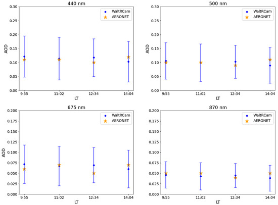 AERONET AOD (orange stars) and WaltRCam AOD and its associated standard deviation (blue dots and vertical lines) at 440, 500, 675, and 870 nm as for 9:55, 11:02, 12:34, and 14:04 LT.