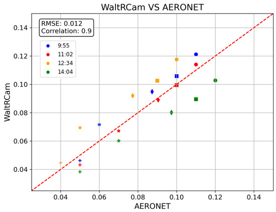 The errors obtained are reasonable compared to AERONET, with the highest bias being 0.014 at 12:34 and lowest bias being −0.015 at 14:04 LT. Note that biases are positive for 9:55 and 12:34 LT, indicating slight overestimation, while the bias is negative for 11:02 and 14:04 LT, suggesting slight underestimation. The relative bias is minimum at 11:02 LT at −3% and maximum at 12:34 LT at 20%. The RMSE is 0 for 11:02 LT and 0.02 for 12:34 LT and 14:04 LT. Figure 8 presents the comparison between WaltRCam and AERONET AODs. As already said, the WaltRCam results remain fairly close to the AERONET data, with a correlation coefficient of 0.9 and weak variability around the 1:1 line. The RMSE is 0.012, which is relatively low.
