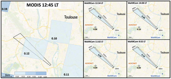 Finally, we evaluate the WaltRCam AOD data with the Terra satellite MODIS instrument data that was described in Section 2.2.2. MODIS mad a daily pass over the greater Toulouse area at 12:45 LT on 30 June 2020, which is close to the time of a WaltRCam measurement (12:34 LT). Figure 9 shows the AOD values measured at 550 nm over the greater Toulouse area. Each MODIS pixel corresponds to an area of 9 km (3 km × 3 km), whereas WaltRCam covers a smaller area corresponding to about a 3.3 km quadrilateral, as shown in this figure. MODIS AOD measurements are available over a part of the study area and give a similar result to the WaltRCam’s AOD for this specific zone. Note that MODIS pixels are coarse because of the DT algorithm, which likely discards non-convergent pixels. The AOD measured by MODIS in this area shows a value of 0.12 at 12:45 LT in a MODIS pixel colocated with the WaltRCam’s field of view, which provides an AOD value of 0.09 at 12:34 LT, and for the AERONET data, the AOD is 0.08. It should be noted that the MODIS instrument on the Terra satellite, as a sun-synchronous satellite, provides one AOD value per day, while the WaltRam camera can potentially provide several AOD values per hour. The observation frequency capability of the WaltRCam will allow measurement of diurnal AOD variations.
