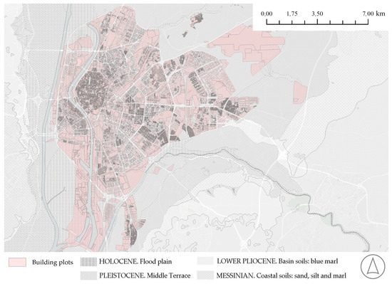 The general geology of the urban area of Seville and its surroundings is based on Neogene and Quaternary sediments typical of the Guadalquivir Basin (Figure 1): mainly clays, silts, sands, gravels, and marly clay strata [35], although small areas exist where these layers of soil alternate or even disappear. These alterations are due to the variability of the subsoil, and in some cases were caused by artificial transformations of the course of the Guadalquivir River, which has always flowed through the city as the only navigable river in Spain since its origins [36]. Consequently, the presence of groundwater is very close to the surface, which constitutes another key factor to be taken into account.
