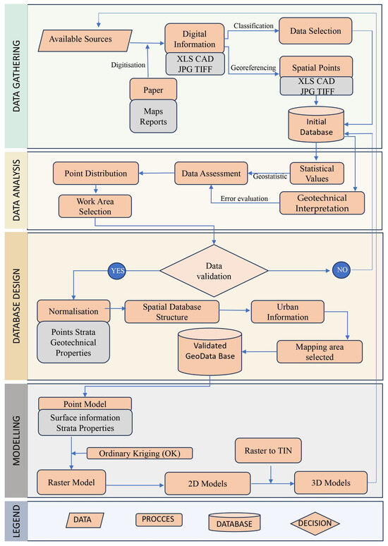 This section describes the set of steps of a replicable methodology that allows the integration of geotechnical information collected in urban sites. Figure 2 shows the main phases of the design of a spatial dataset that leads to the automatic visualisation of digital models that evolve the knowledge of the urban underground.