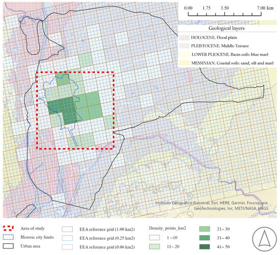 Complementarily, the distribution analysis displays the degree of spatial homogeneity of the information, determined through the behaviour of the coincident spatial grids. The definition of grids is usually carried out by determining the size, proportion, orientation, and extension of the comprising cells. For this case, the GEOSTAT Grid Dataset 2011 was employed to visualise the spatial distribution of the recorded points [53]. This dataset is also published and spatially filtered by the Seville City Council Spatial Data Infrastructure (IDE Sevilla), which provides various grids with squared cells that range between 0.25, 0.50, and 1.00 km in length [54].