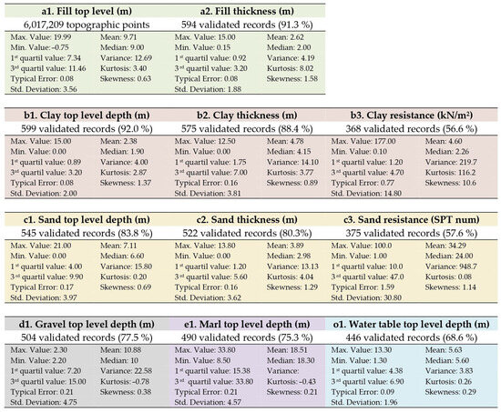 Finally, the validity of the data has been corroborated by determining the typical error values and standard deviation. Through this methodological step, anomalous and erroneous results have been removed, which has led to a definitive selection of data regarding the subsequent modelling. Gaps of information have also been detected in certain parameters, or non-existent soil layers in certain areas of the city. In this respect, it can be observed that none of the selected parameters has the full number of 650 records collected in the database. The maximum acceptance values, above 90%, correspond to the upper levels of the soil layers, while the lower values, lying below 60%, correspond to the data related to the resistance of the layers.