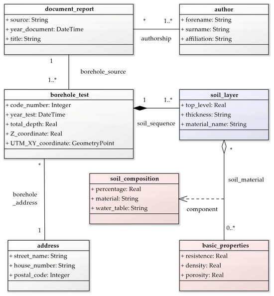 The standardisation work has made it possible to define a relational database (RDBMS) proposal that is organised based on the Unified Modelling Language (UML) class diagram shown in Figure 6. Its design is oriented to work with the basic information for the visualisation of the layers and the mechanical properties of the soil, being susceptible to future evolutions to generate more complex data flows.