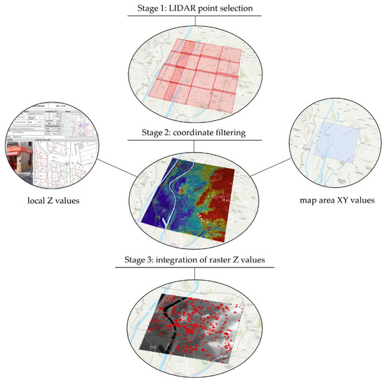 Through the process shown in Figure 7, the database points within the mapped area have been assigned global Z coordinates. The starting point is to download the LIDAR points in LAZ format, which are provided by the PNOA in Seville (Figure 7, Stage 1). During the decompression process to LAS format, the points are spatially filtered. The mapping area was employed to establish the XY coordinates, while the local geodetic information provided by IDE Sevilla verified the Z coordinates and made it possible to eliminate incorrect height values (Figure 7, Stage 2). This local geodata contain a much smaller number of points but are still strongly representative due to the high quality of the information sheets they provide. Once a filtered LAS dataset of the working area has been created, a raster file is generated and overlaid within the selected geotechnical points (Figure 7, Stage 3). This completes the topographic integration process by assigning Z values to the points through the raster.
