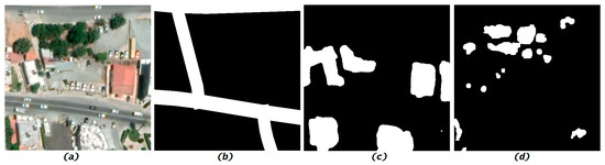 To determine the similarity between two satellite images, we examine three major concepts that are paramount in landscape similarity determination: the road network, the building surfaces, and the tree arrangement. The building and tree maps were obtained from proprietary AI models developed by the authors and the road network was obtained from a GIS layer. From left to right: (a) the original RGB satellite image, (b) the binary mask of the road network, (c) the binary mask of the building surfaces, and (d) the binary mask of the tree foliage.