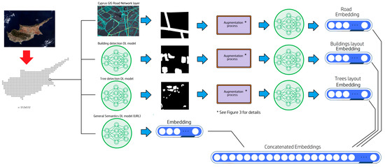 As described in Section 2.1.1, the BT algorithm was used for training models to output similar embeddings for similar inputs and dissimilar embeddings for dissimilar inputs, according to a certain concept each time. As mentioned above, we used four concepts that are dominant in remotely sensed optical images: road networks, building arrangement, tree arrangement, and general image semantics. Each model built a feature space for the concept it was exposed to and learned how to combine the emerging domain patterns to calculate the embedding of an input. Since the models’ training objective function minimizes the cosine similarity between the embeddings of similar images, the model learned to map images of similar appearance to feature space areas that were in proximity in terms of cosine similarity. However, examining the overall similarity of two images by considering various aspects of them required some modifications to the way the original BT algorithm creates different views of the data points (see Section 2.1.3). For example, the road similarity model should receive as input a binary mask representing the road network depicted in the image. The building similarity model should receive as input a binary mask showing the buildings in the image, while the tree similarity model should receive as input a binary mask representing the trees in the image. The semantic similarity model accepts RGB images as input and complements the similarity models that perform inference based on binary masks of the main concepts (roads, buildings, trees). The road mask was extracted from a Geographic Information System (GIS) road network layer of the island of Cyprus. The buildings’ mask was extracted from a GIS layer created by the authors with an AI segmentation model they developed that identifies the contours of buildings depicted in Google Earth images [35]. Finally, the tree mask was extracted from a GIS layer created by the authors with an AI tree detection model they developed to count trees in satellite images [36,37]. Figure 1 shows an example of a Google Earth image and its concept masks extracted using the GIS layers empowered by the AI models mentioned above. Figure 2 shows the data flow of the proposed approach for landscape similarity matching.