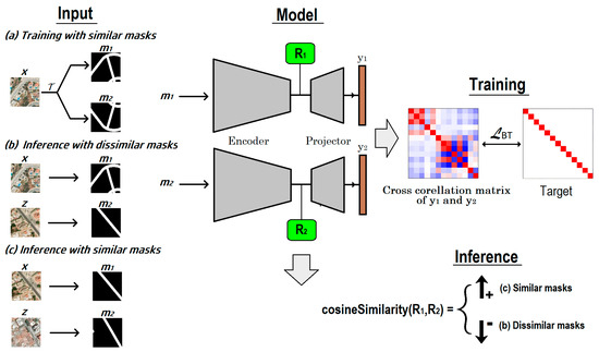 Training and inferring concept similarity based on the Barlow twins algorithm. The example relates to the road network concept, but the processes generalize to other similarity concepts (buildings, trees). (a) Training with similar masks: Two views of image and ) pass through the model whose weights are adapted so that the cross−correlation matrix of the two output embeddings has a diagonal with values 1 and every off−diagonal element is zero. (b,c) Inference: The concept masks extracted from two different images and pass through the model to obtain the intermediate representations and their cosine similarity is computed. If the images are similar, the cosine similarity should be high, otherwise it should be low.