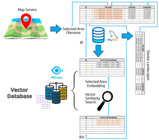 The identification of similar landscapes based on a query image starts with the interaction with an online map service that allows the user to select a certain location of her choice contained in an ROI. Next, the map service translates the selected coordinates into a file path, which is used to query the MySQL database to obtain the ID of the query image. Then, this ID is used to retrieve the embedding of the query image from the vector database. After the query embedding is available, an embedding similarity search is conducted to find the ID(s) of the image(s) with the most similar embedding(s). Finally, the retrieved ID(s) is/are matched in the MySQL database and the details of the results (file path, coordinates) are returned to the user.
