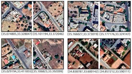 We used Google Earth images for our image retrieval application because they provide high spatial resolution (~30 cm/pixel), they are relatively easy to acquire, and they are (fairly) frequently updated (i.e., every 4–6 months). The satellite images used in this study were acquired on June 2022 and spanned the southern part of the island of Cyprus. The images were split into patches of pixels, providing nearly million patches in total. We used of the patches for training the URL models with the BT algorithm and 20% of the patches for test purposes (visual inspection of the similarity between retrieved images during inference). In all four models, the backbone was a ResNet34 architecture outputting a multidimensional normalized representation for every input satellite patch.